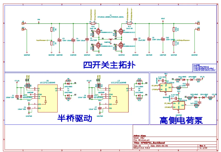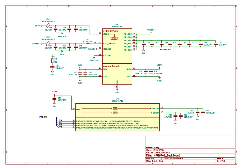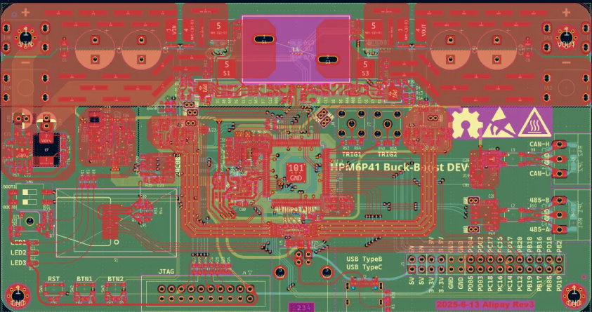 在国产MCU日益发展的当下,作者通过视频宣传,群友推荐等渠道了解到了先楫半导体(HPMicro),也通过HPM出售的各种EVK(6750EVKMini、5300EVK、6E00EVK等)体验过HPM带来的高性能体验;不过,限于EVK的设计目的,部分引脚被板上的外设占用,所以作者决定以HPM最近发布的HPM6P00系列为基础,设计一款电力电子方向的开发板 尽管6P00的运动控制系统精心设计,性能优异,但是我仍然选择了四开关BuckBoost(也称同相BuckBoost)作为开发板的主体功能,这是因为作者曾以此作为毕业设计题目,进行过一定研究,预计可以减少设计过程中的谬误,且硬件闭环等功能经过恰当配置也许可以应用于本项目。