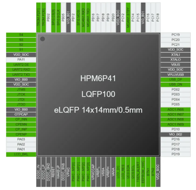 从下图可以看到HPM的PinOut还是一如既往的整齐,单个外设的功能引脚分组往往都是就近引出,有利于PCB绘制的布线。