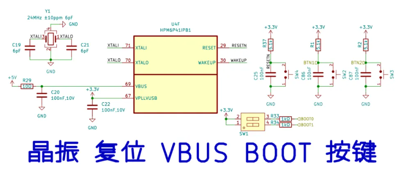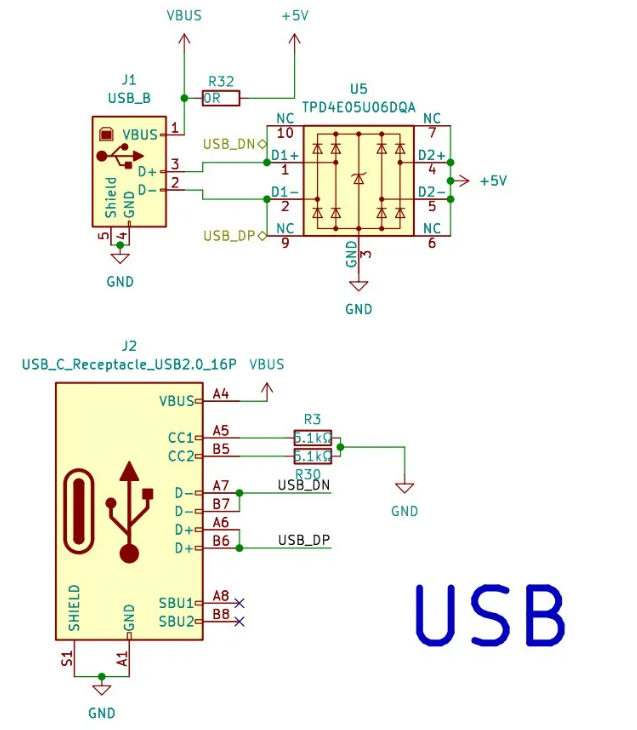 写配套的上位机共同调试运行,在本项目中提供了USB Type-B和Type-C接口,主要看重了B口的坚固耐用和C口的便利性,不过在作者实际调试中已经考虑将B口换为A口。VBUS被连接到MCU的对应管脚,供USB外设使用。