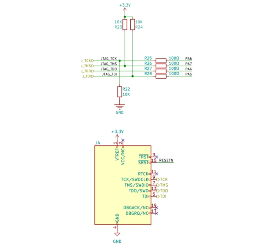 JTAG引脚为PA4~PA7,连接了适当的终端电阻与上下拉电阻,通过20p简易牛角座连接到外部调试器。
