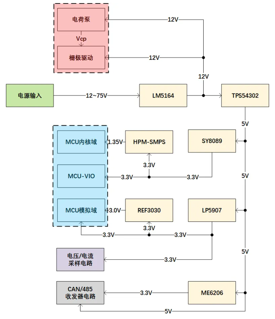 HPM的电源域在设计时需要提供内核电压(VDD_SOC)、IO电压(VDD_IO)、模拟域电压(VANA)、模拟参考电压(VREFH、VREFL),并为片内LDO提供外部去耦电容。