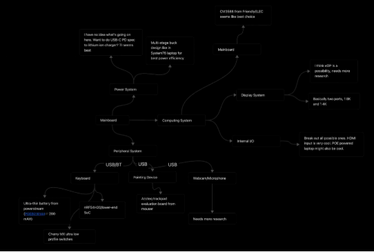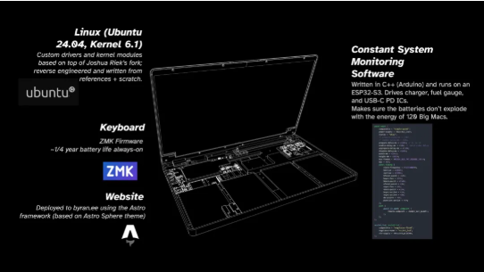 机箱布局相当简单:底部是电池,右侧是电源板,左侧是主板,顶部是铰链装置。还有一个透明的 PETG FDM 打印电源按钮,可以在定制的 PCB 板上实现背光效果。为了平衡不对称的铰链(主板太宽造成的),左侧也有一根小碳纤维杆。
