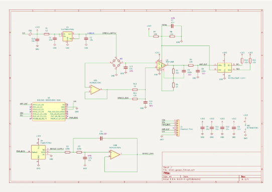 项目中采用四元件全桥电路(或两元件半桥),将四个应变电阻对称布置在PCB上。当PCB弯曲时,部分电阻拉伸(阻值增大),另一部分压缩(阻值减小),电桥失衡产生差分电压。这种设计能放大微小信号并补偿温度漂移。