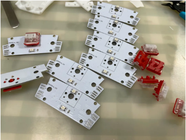 按键 PCB 使用细小且柔软的 3 线电缆串联,它们是 G、IN/OUT、V,分别代表地、信号进/出和电源。按钮开关信号引脚还没有焊接,你可以后面再焊接。请不用担心按钮 GPIO 的顺序,因为它们可以通过命令行重新映射。