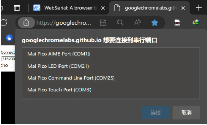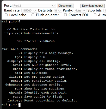 它有一个命令行进行配置。你可以使用这个 Web Serial Terminal 连接到 Mai Pico 的 USB 串口。(注意:"?" 是帮助)