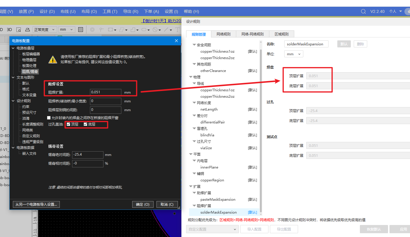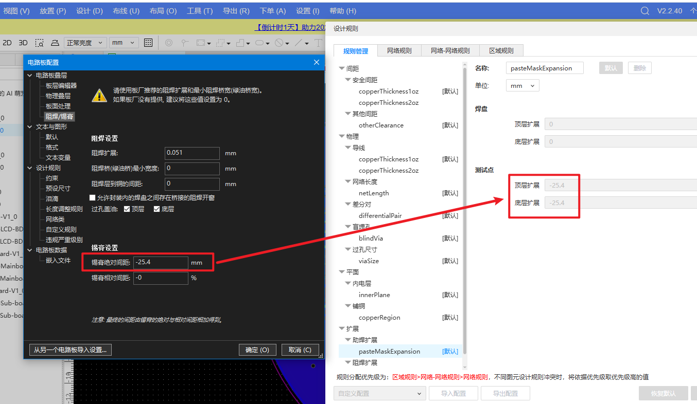 设置完成后进行重新铺铜,之后进行锡膏层的检查,发现许多器件的焊盘缺少锡膏,选择“封装”,然后点击器件,在“间距重写和设置”中,将“锡膏绝对间距”设置为0即可。