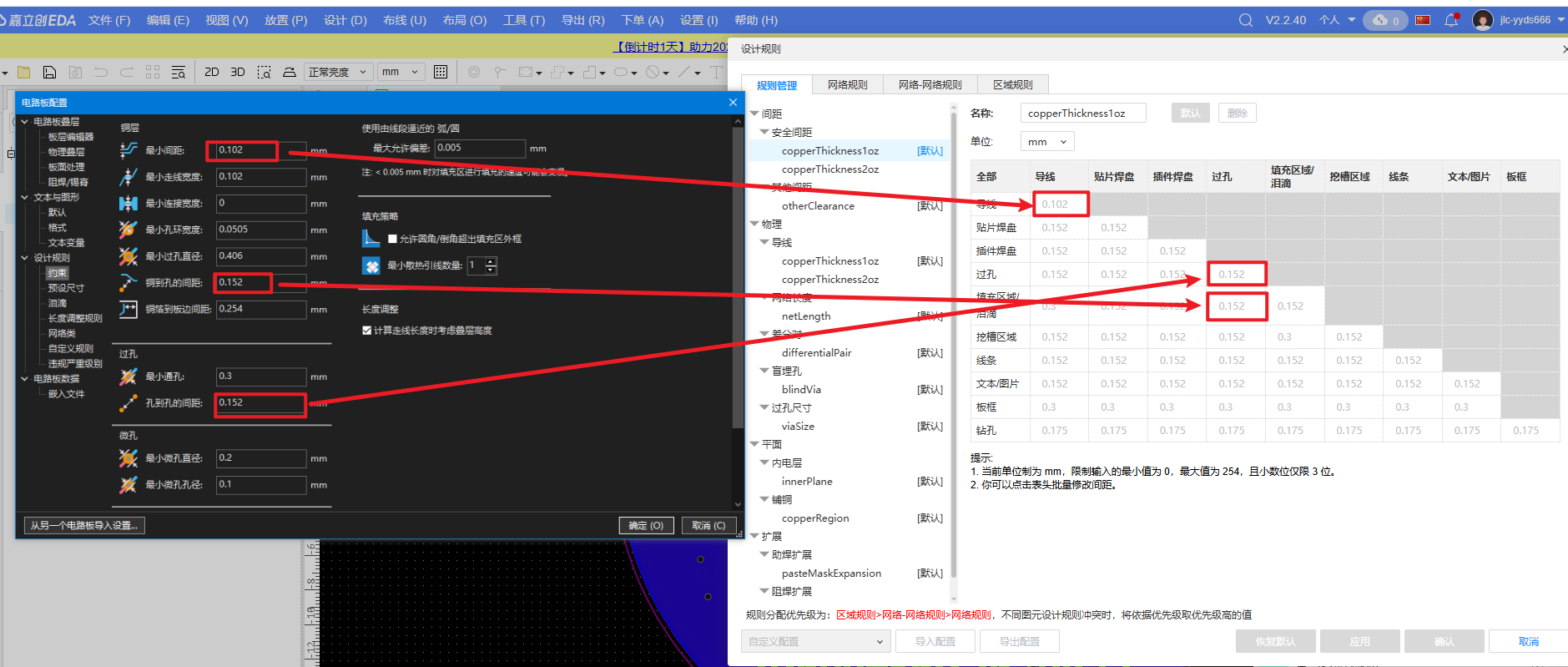 导入PCB后最重要的其实还是要进行电路板规则设置,点击立创的“设计规则”,将单位设置为mm。