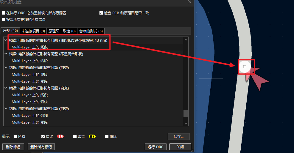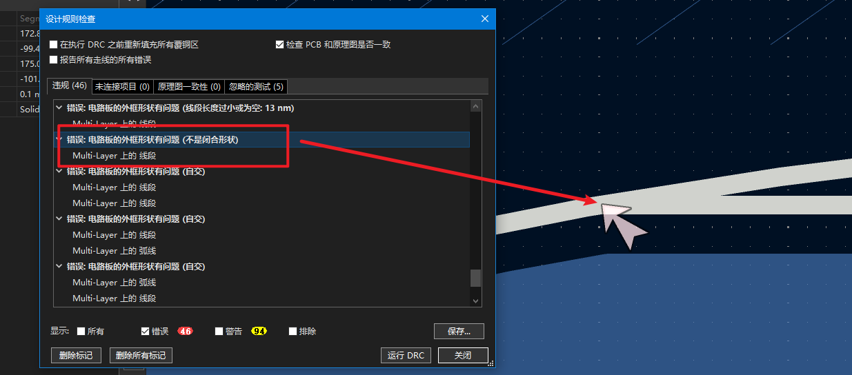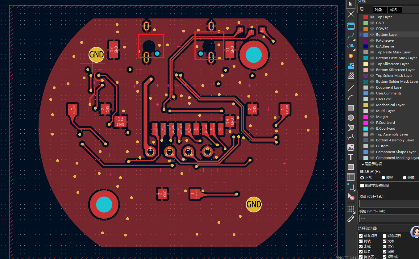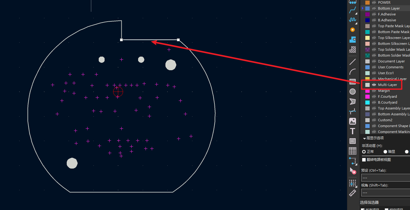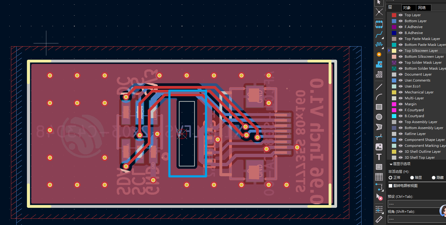 导入PCB后,第一个重大发现就是原来的“孔”变成“洞”了,原因是KICAD的板层命名和立创有区别,最重要的板框层在立创上叫做“多层”,导入KICAD中时会发生外框线没有对应的错误,需要手动调整。一些NPTH孔也需要在Multi-Layer中进行绘制。