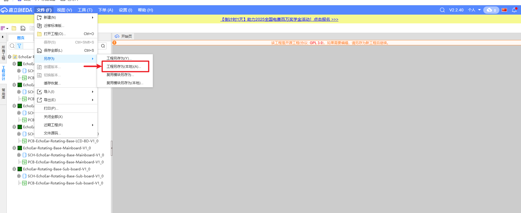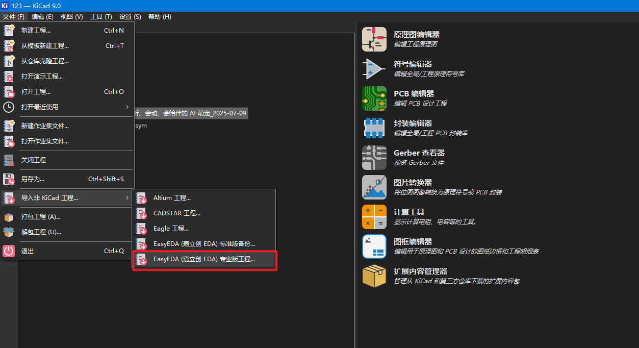另存的文件名后缀是.epro,是立创专业版的文件,在KICAD中,直接选择导入非KICAD工程下的嘉立创专业版工程。选择文件导出到的文件夹路径,点击“是”进行导入。