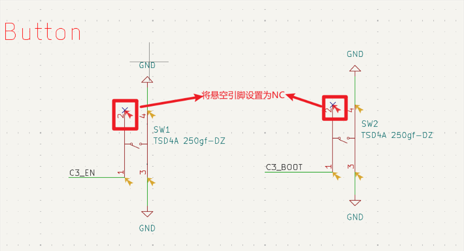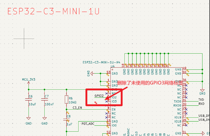 ERC时提示GPIO3网络标签未用于别处,故手动删除了,并将悬空引脚进行了NC处理。