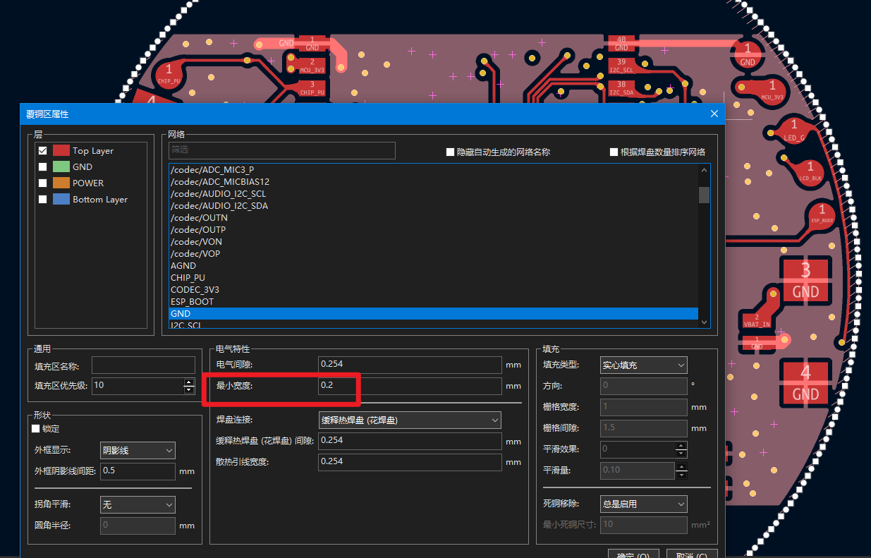 为了与原始PCB保持统一,将铜皮的最小宽度改为0.2mm,这样一些窄的地方也可以吃进铜皮,保持了统一。