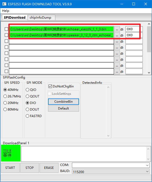 点击OK进入下一界面,这里需要提前下载好固件程序,可以直接使用附件中的固件,选择固件并在右边栏输入0X0,绿色表示可以使用,然后点击START即可开始进行烧录,烧录完成也需要重启喵伴完成烧录。