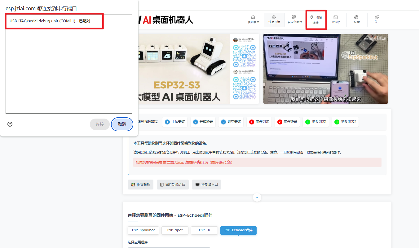 进入乐鑫官方的网页端固件烧录端口,用一条数据线连接喵伴和电脑,打开喵伴,在页面顶端的“设备连接”处配对USB端口
