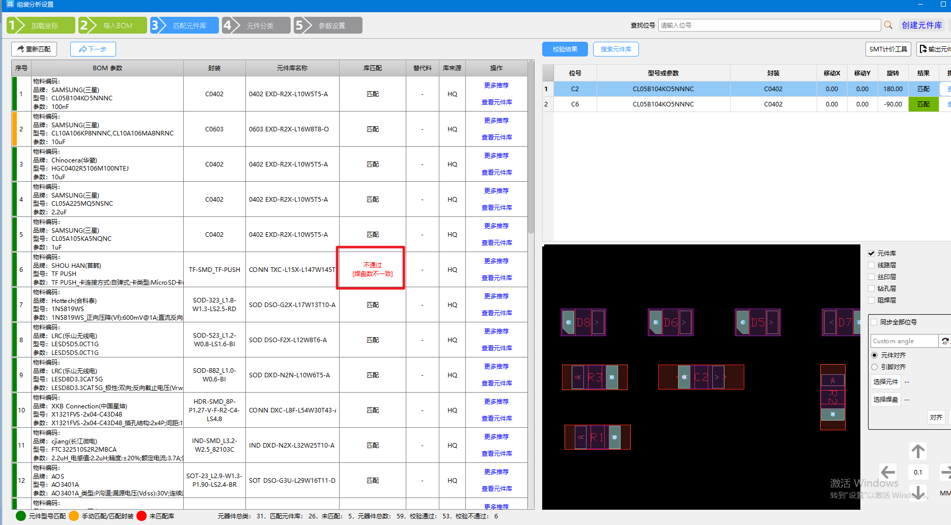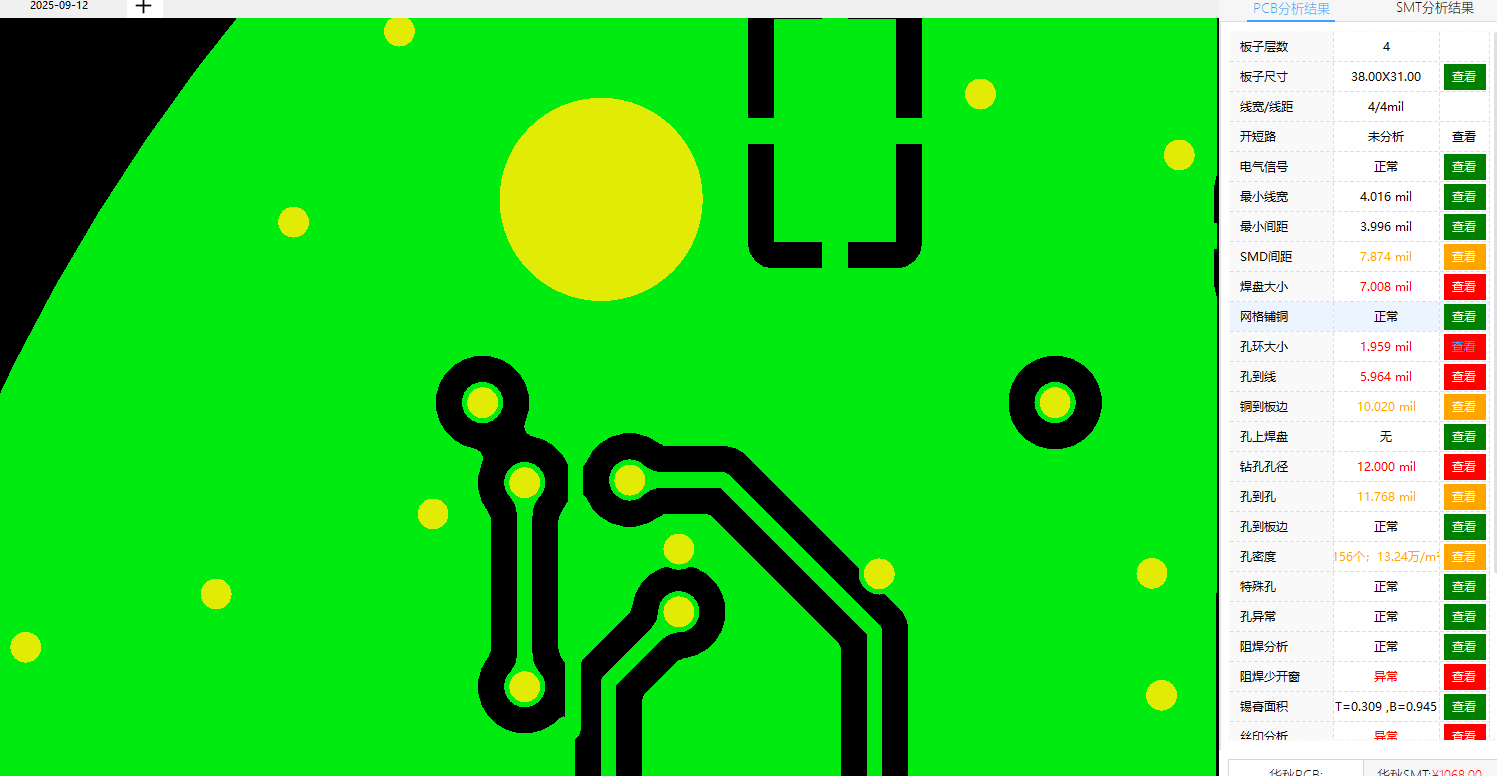 打开华秋DFM软件并导入生成的Gerber文件,上传坐标文件、BOM文件,DFM会自动分析一些常见的贴片问题,帮助我们快速分析板子是否有加工问题,根据提示逐一查看问题,以确保都在可控范围内