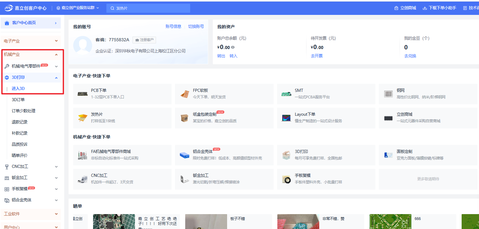 确保与设计一致后,点击下单,进入订单中心界面,由于本人需要SMT,故点击PCBA下单,上传文件,其余选项默认即可,注意板厚选择1.2mm,点击立即下单,优惠券会在付款时使用。