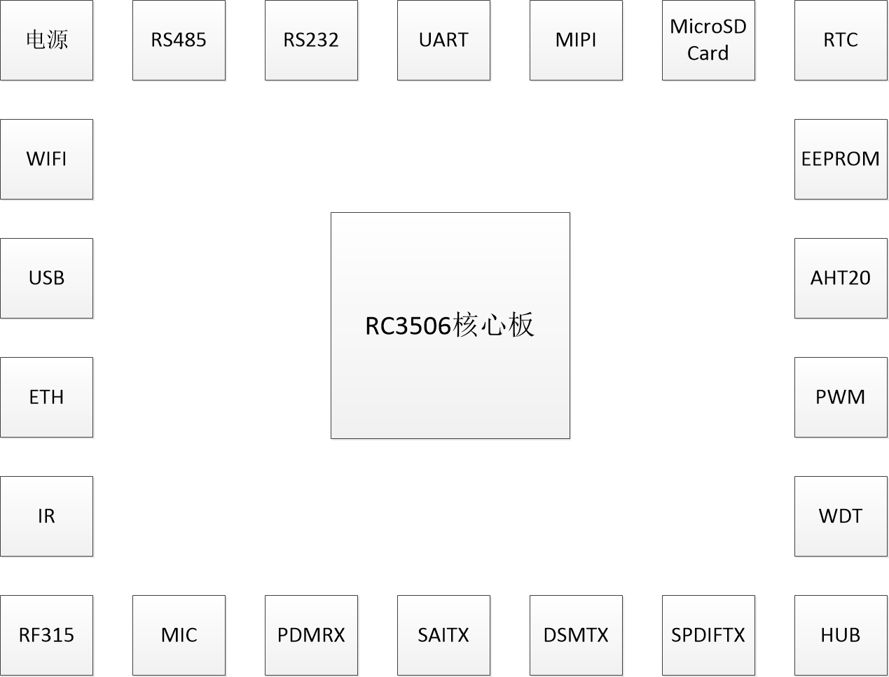 本产品基于 睿擎 RC3506平台开发,采用工业级、大部分国产化设计。功能要求支持 485、232、串口、USB、TYPEC、以太网、CAN、MIPI、WIFI、SD卡、RTC、EEPROM、温湿度传感器、PWM、硬件看门狗、USB-HUB、SPDIFTX光纤输出、红外接收、315无线接收、I2S音频输出、PDMRX_MIC输入。多媒体处理中心有丰富通信的接口可共选择,人机交互接口、无线等,多集成化的一款设备,适用于智能家居、网关、数据处理中心等场景,也可做开发板学习使用。