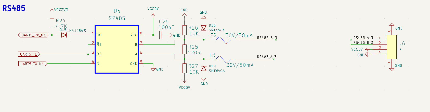 采用SP485 芯片,用于 RS - 485 和 RS422 通信的低功耗收发器。该集成电路包含一个驱动器和一个接收器。SP485 驱动器的压摆率不受限制,使其传输速率可达 2.5Mbps,接口做防静电设计。