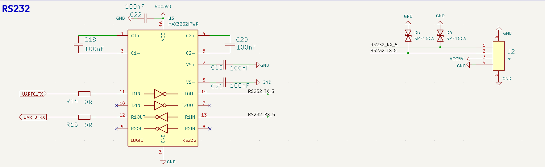 采用MAX3232芯片,设备包括两个线驱动器、两个线接收器和一个双电荷泵电路,具有±15-kV ESD保护。该设备符合TIA/EIA-232-F和ITU V.28标准,支持3-V至5.5-V Vcc电源,数据速率高达250 kbit/s。接口做防静电设计。