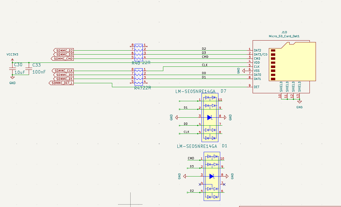 接口带防静电设计,带有无卡检测设计,置于背板方便插卡,用于存储文件等(与wifi共用sdio总线,使用时需电阻跳线处理)