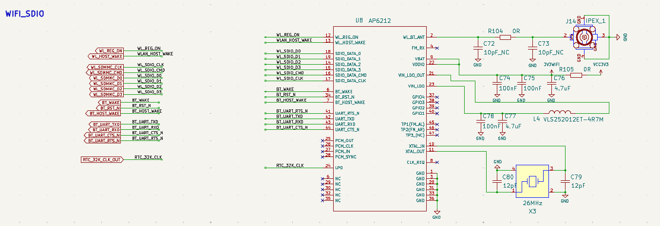 1选用AP6212模块,低-成本和低-功耗模块,具备WiFi和蓝牙功能。高度集成的模块使网页浏览、VoIP、蓝牙耳机等应用成为可能。具有无缝漫游功能和高级安全性,可与无线局域网中不同供应商的802.11b/g/n接入点进行交互。无线模块符合IEEE 802.11 b/g/n标准,在802.11n草案中,单流速度可达72.2Mbps,在IEEE 802.11g中可达54Mbps,在IEEE 802.11b中可达11Mbps以连接到无线局域网。集成模块为WiFi提供SDIO接口,为蓝牙提供UART / I²S / PCM接口。该紧凑型模块是WiFi + BT技术组合的整体解决方案,专为智能手机和便携式设备开发。