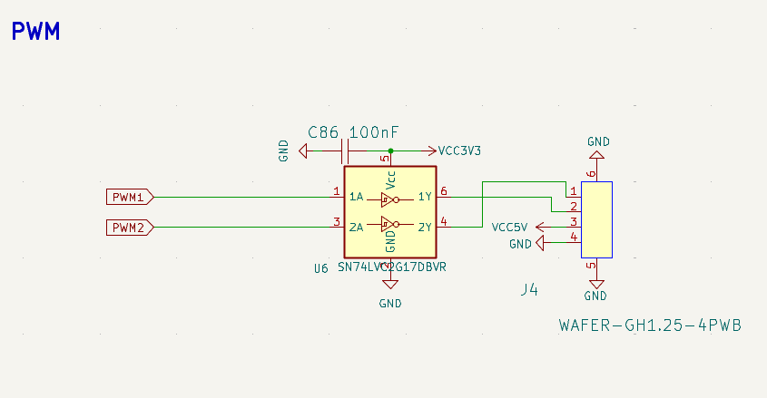 2路pwm输出,增加缓冲器SN74LVC2G17DBVR,增强稳定性。