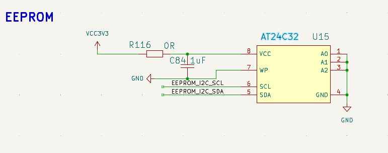 选用CAT24C32,CAT24C32 是一款 32-kb I2C 串行 EEPROM 器件,内部组织为 4096 个词,每个词 8 位。它具有 32 字节页写入缓存,支持标准 (100 kHz)、快速 (400 kHz) 和超快 (1 MHz) I2C 协议。外部地址引脚使其能够在同一个总线上放置最多八个 CAT24C512 器件。