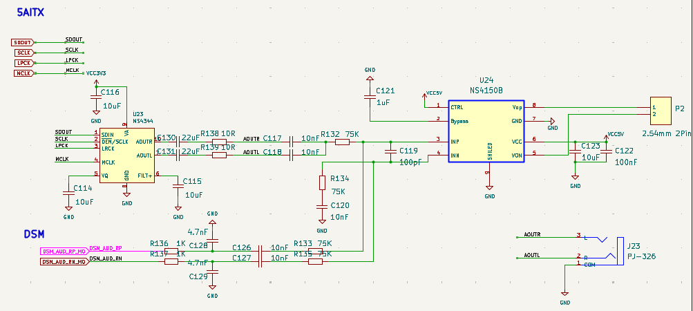 2采用核心板自带dsm接口,配合NS4150B功放,接扬声器实现音频输出