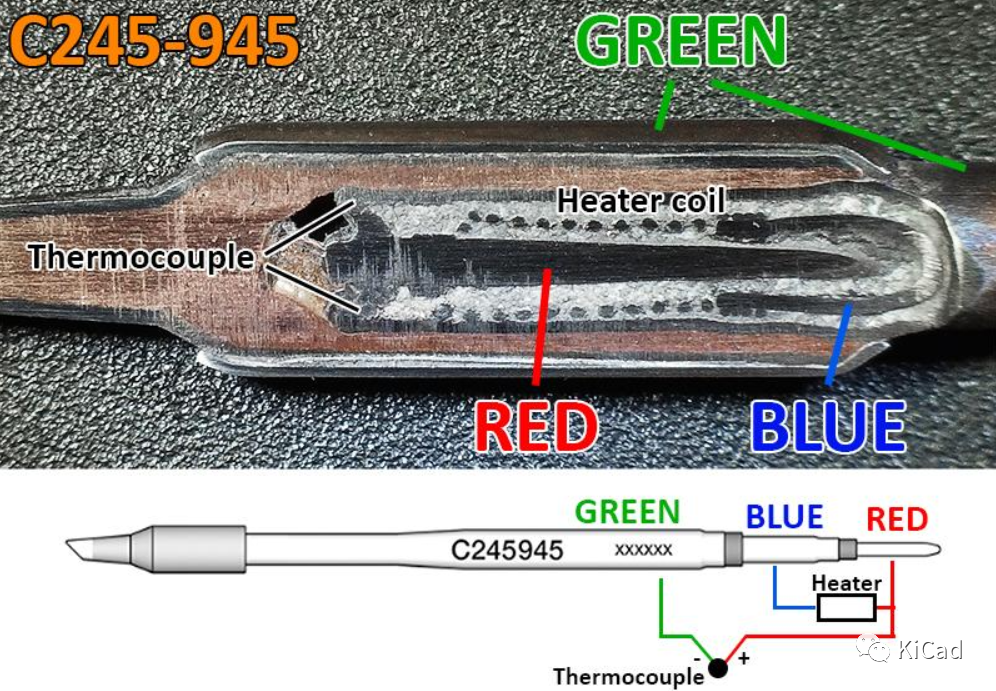 JBC 的烙铁头均包含一个用于读取尖端温度的热电偶元件和一个电阻加热器元件。不同型号烙铁头的热电偶和加热元件的配置略有不同。为了了解烙铁头的内部构造,我拆了两个烙铁头: