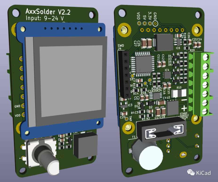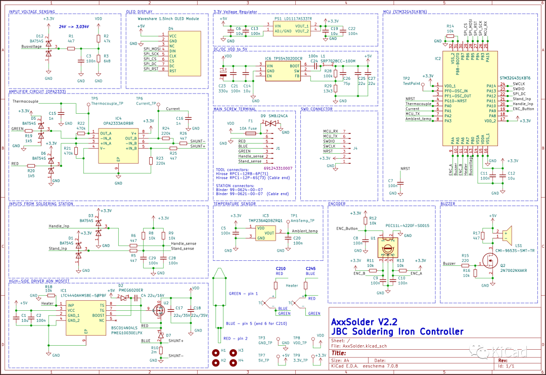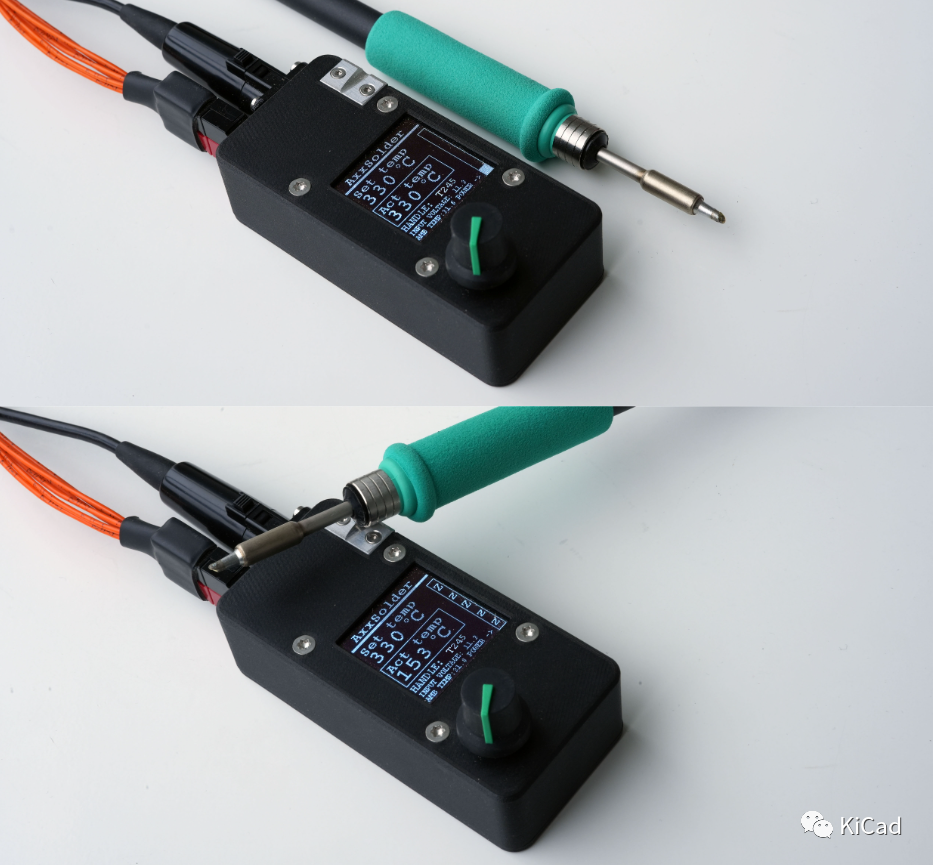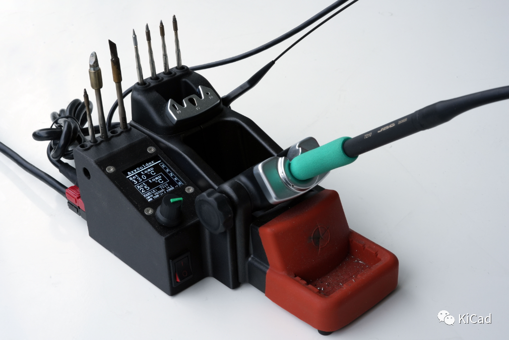 AxxSolder 是一款基于 STM32 的烙铁控制器,适用于 JBC C210 和 C245 烙铁头。围绕相同的 PCB 和软件设计了两种不同的版本 - 一种基于 JBC ADS 支架的焊台,另一种是便携式版本。硬件采用 9-24V 的直流输入源。软件是为 STM32G431KB 编写的,实现了用于温度控制的 PID、LCD 驱动器以及手柄静止时的睡眠功能。焊台和便携式版本的外壳均采用 3D 打印,设计文件可在 /CAD 下获取。