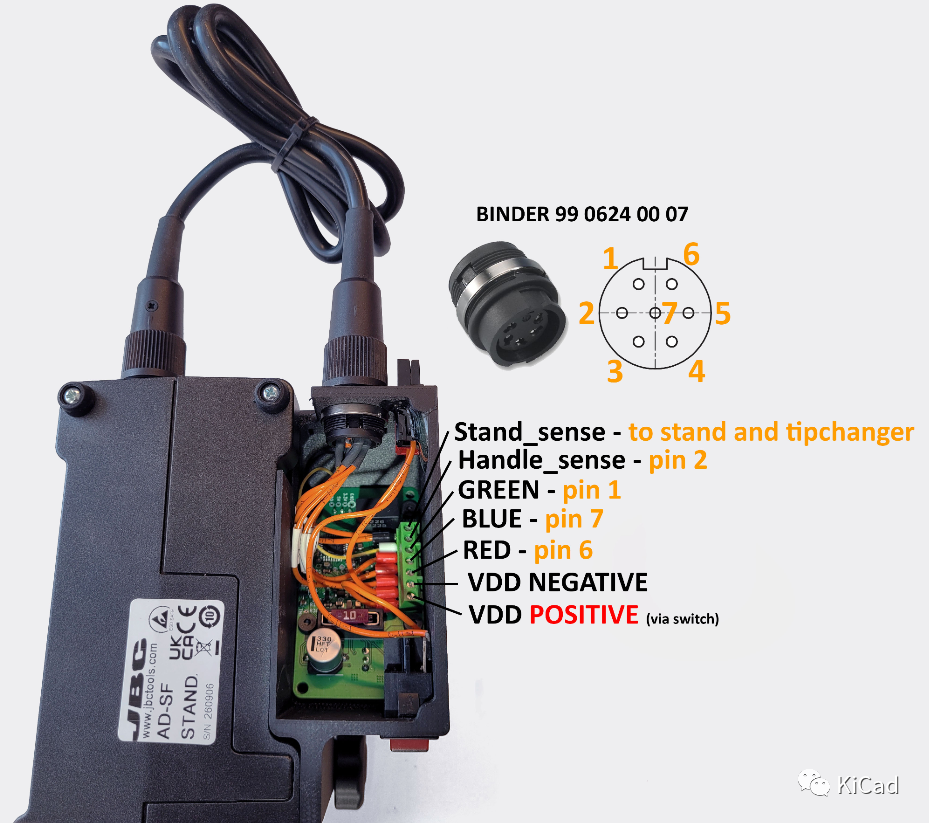 通过 BINDER 99 0624 00 07 连接器从焊台到 PCB 的连接如下所示。AxxSolder 上的 Stand_sense 输入连接到第 4 针和第 5 针。