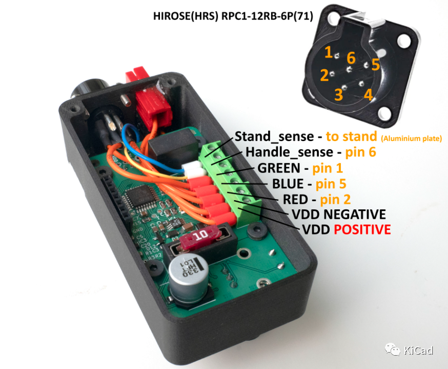 通过 Hirose RPC1-12RB-6P(71) 连接器从手柄到 PCB 的连接如下所示。便携式版本中的蓝色电线连接到铝板,铝板告诉 AxxSolder 在与烙铁接触时进入睡眠模式。黄线连接至引脚 6,用于确定连接的是哪个手柄。