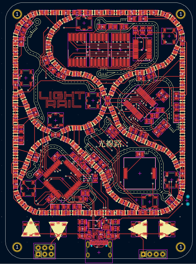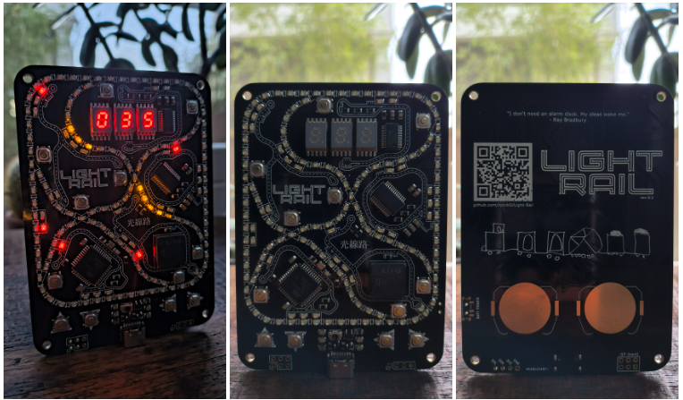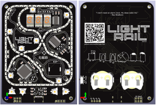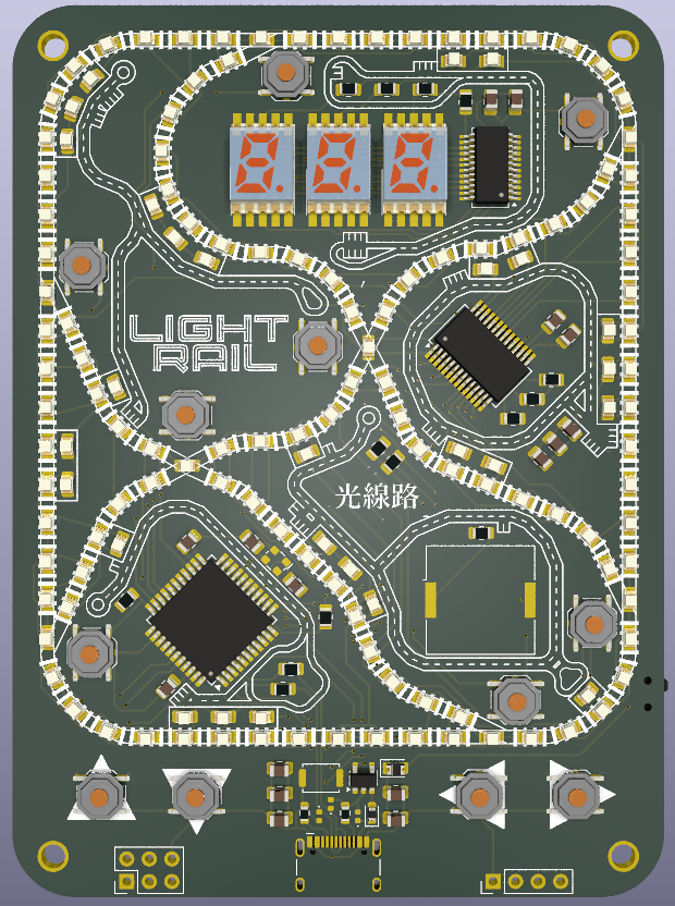 Light Rail 是一款简约的互动式 PCB 游戏,模拟火车沿着轨道行驶,在站台上装卸货物。轨道由成行排列的黄色 LED 灯组成,这些 LED 灯依次点亮,营造出火车沿着轨道行驶的效果。轨道上的八个岔路口和十字路口旁边各有一个按钮,用于切换其状态。电路板上还有一个三字符七段显示屏,用于显示游戏状态和/或分数,轨道下方还有四个按钮,用于控制游戏。轻轨可使用两节 LIR2032 电池或通过 USB 供电。