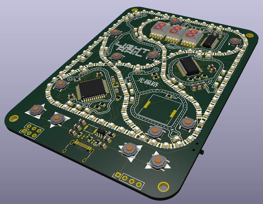 布局设计无疑耗费了最多时间。我首先粗略排布LED灯珠构成轨道外环,随后勾勒出PCB轮廓。KiCad的光线追踪渲染功能在此阶段极为实用,帮助我直观调整LED间距与整体比例。为获得更真实的观感,我甚至找来与PCB尺寸相仿的平面物体举在显示器前比对。外环确定后,以手稿草图为基础绘制内部轨道与道岔。当基础轨道布局初现雏形时,欣喜地发现仍有充足LED可用于站台设计,遂在各轨道区段添加集群式灯珠。