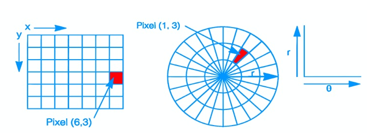 一般图像使用的是笛卡尔坐标系。但为了在旋转 POV 显示器上显示图像,我们必须使用极坐标。在笛卡尔坐标系中,位置由水平距离(x)和垂直距离(y)指定。而极坐标则基于圆形网格,位置由半径(r)和水平角度(θ)指定。因此,像素并不均匀:随着与原点距离的增加,像素的面积也会增加,形状也会改变。
