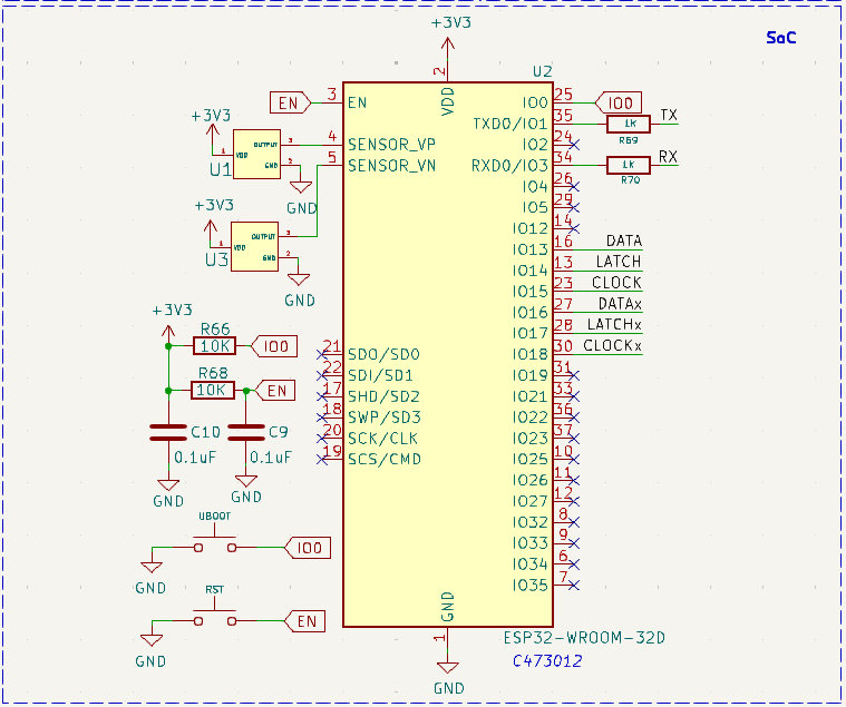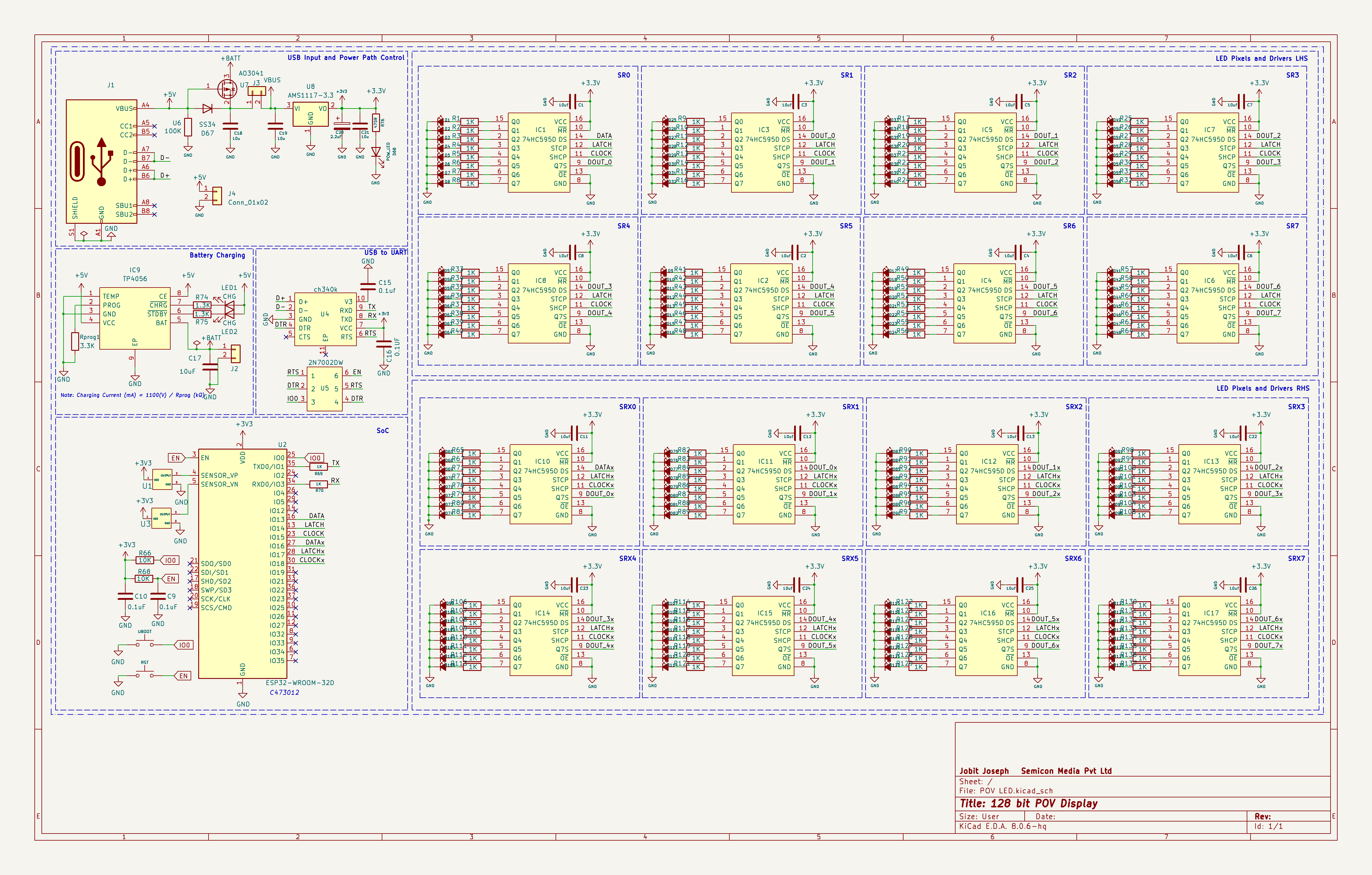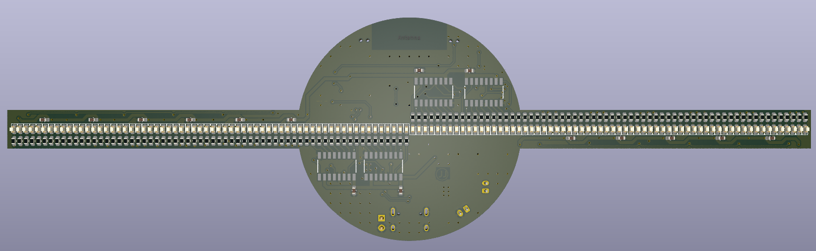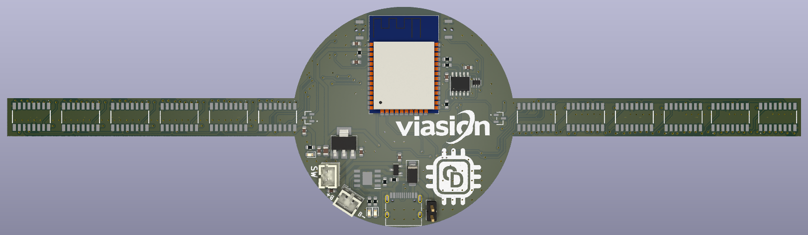 让我们看一下原理图的细节,以便更好地理解。USB Type C 端口用于充电和编程。USB 端口的电源连接到 P 沟道 MOSFET U7 和二极管 D67 构成的电源控制电路。连接器 J4 可用于提供外部 5V 电压。同一端口还可用于连接无线充电器模块,以备在不充电的情况下连续运行。在电压调节方面,使用了常用的 AMS1117 3.3V LDO,它能够提供高达 1A 的电流,满载时的压降约为 1.1V。连接器 J3 用于连接外部开关,以打开和关闭整个电路。为了给内部电池充电,我们使用了 TP4056 充电控制器,其最大充电电流为 1A。现在我们来看看编程电路,它是围绕 WCH 的 CH340K 芯片构建的。为了实现自动复位,我们使用了双 MOSFET 2N7002DW。现在,整个电路的大脑是一个 ESP32-WROOM 模块。我们之所以选择这个 SoC,是因为它价格便宜、易于获得,而且功能强大,能够以足够的帧速率驱动显示屏。LED(像素点)分别位于两个旋转臂,每个旋转臂有 64 个 LED(像素)。因此,我们总共有 128 个像素的分辨率。我们还使用了两个霍尔效应传感器进行转速测量和位置感应。在PCB中,我们原本设计了 SMD 封装,但后来决定使用 TO-92 封装的普通 A3144 传感器,因为它们更容易采购,而且易于安装到当前的支架设计中。