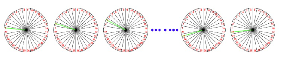 现在让我们来看看 POV 显示屏是如何工作的。请看下图,我们将一个圆平均分成 32 块。如果用这样分割来的方式完成一幅图像,必须在每次旋转就绘制 32 行像素。在显示每一行像素时时,必须根据像素数据来决定每个LED(像素)是点亮还是熄灭。通过快速旋转和逐行点亮像素,就可以在观察者眼中形成一幅连续的图像。