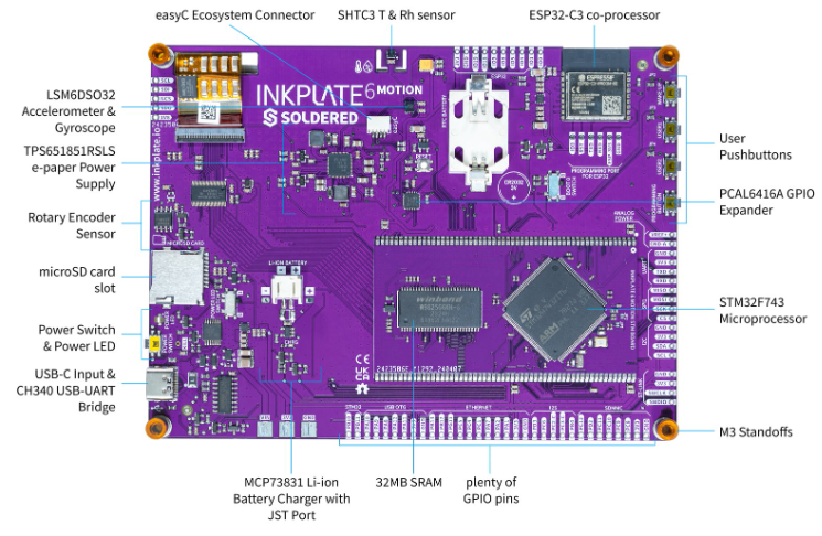 “ Inkplate 6 MOTION 是 Soldered Electronics 公司设计的一款 6 英寸、低延迟的电子墨水屏。主控使用了 STM32H743。 ”