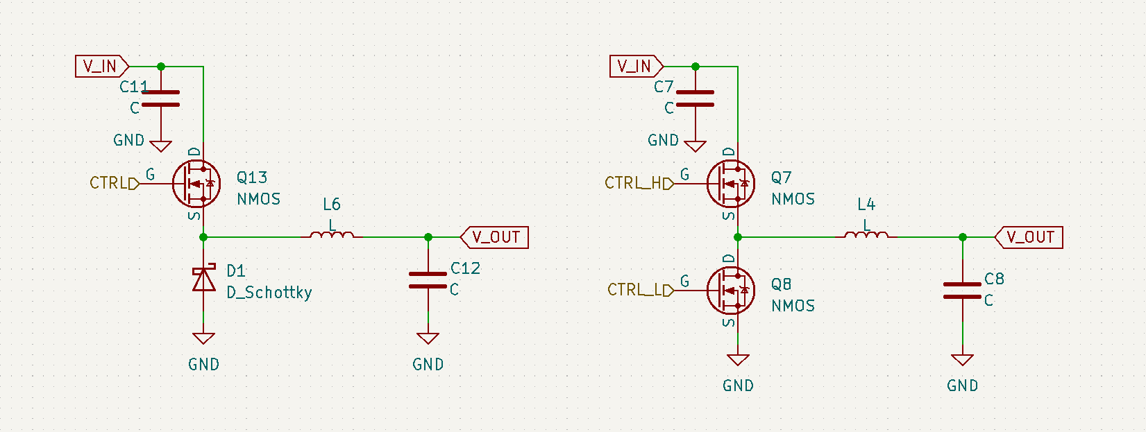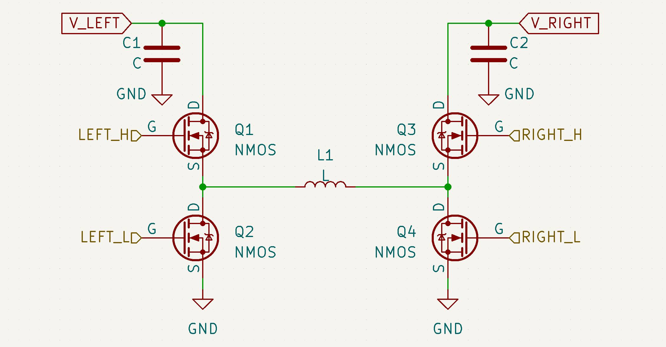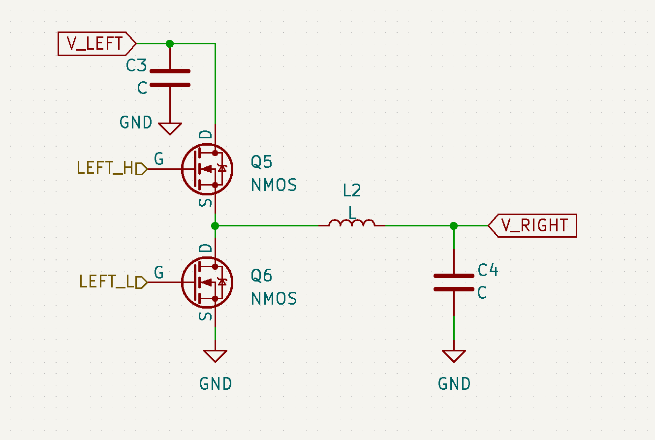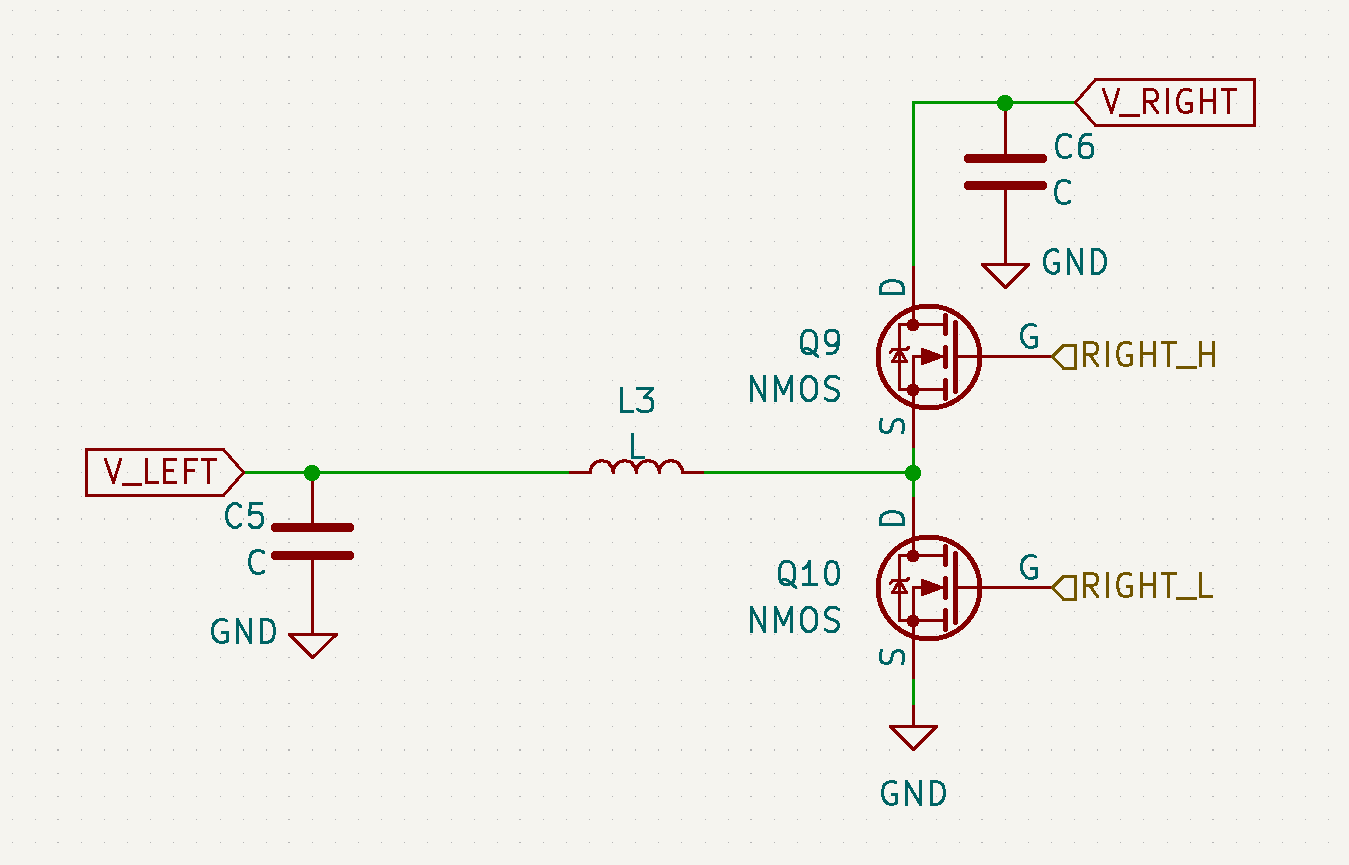 若将RIGHT_H常导通,RIGHT_L常断开,而LEFT_H和LEFT_L继续使用如上的Buck电路控制策略,则等效电路图如下图。这就是完全等效于Buck的拓扑,此时可将电路看作同步Buck,可实现将左侧电降压后提供给右侧。