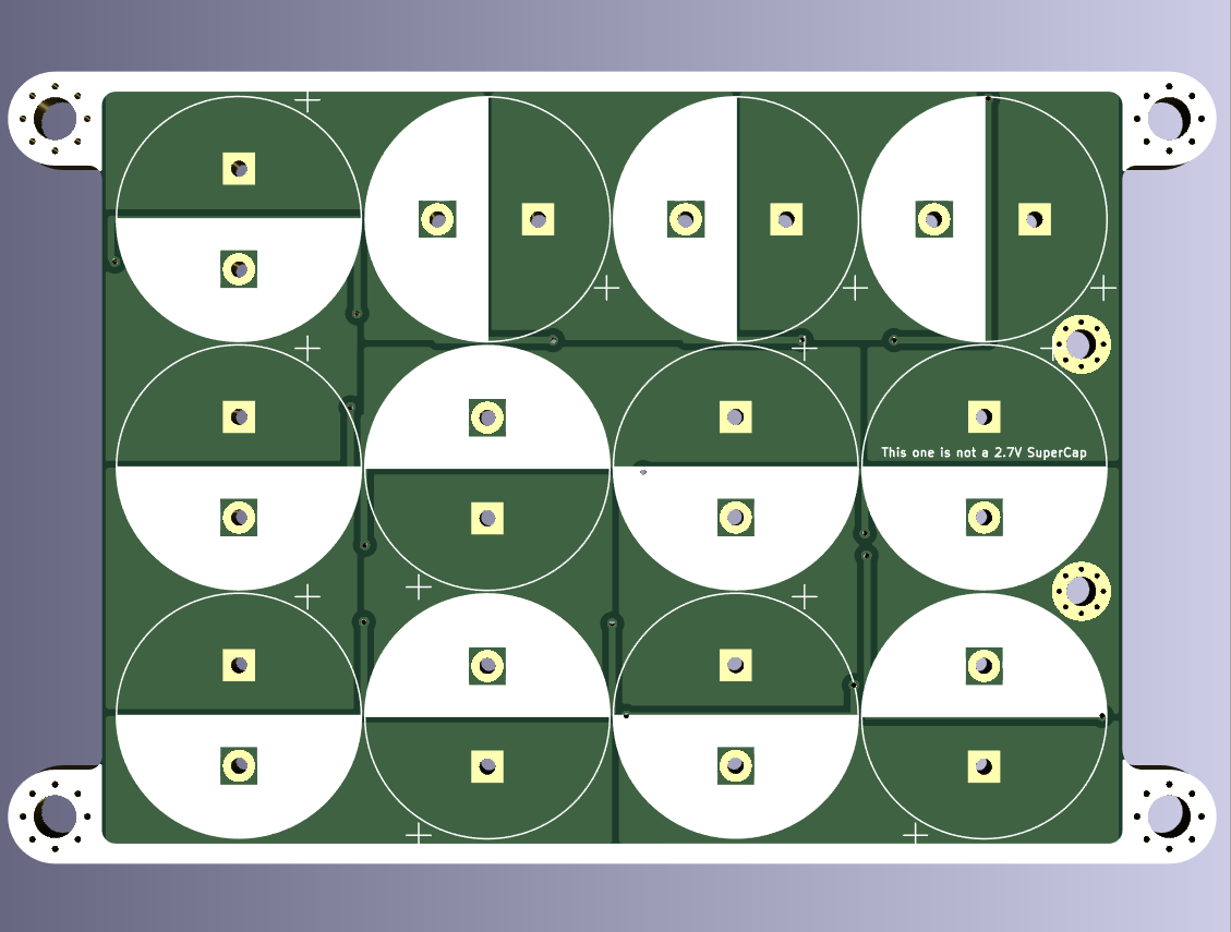 该模块layout较为极限,所有电容紧贴排列。为了加强散热,使用四层板。其中内层1、2与顶层铺铜相同,起导热作用。底层放置MOS与芯片等元件,并利用开窗导线减小电阻。过充测试时,使用2.5A电流长时间对电容组进行充电,电容组未出现严重过热情况,电容未出现过充情况。