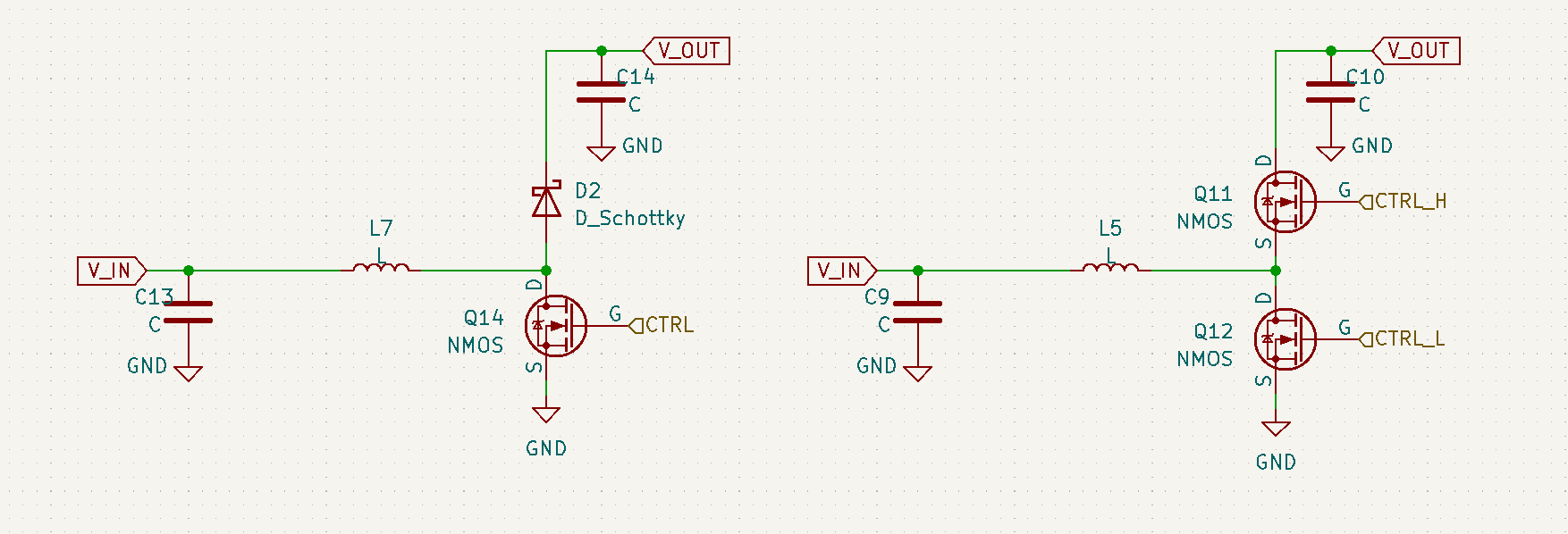 Boost升压。下图左侧为非同步Boost电路,MOSFET对地导通时为电感充能,二极管在此处起到续流和防倒灌作用。右侧为同步Boost电路。用MOSFET替代二极管,在适当的控制下实现了二极管的功能。