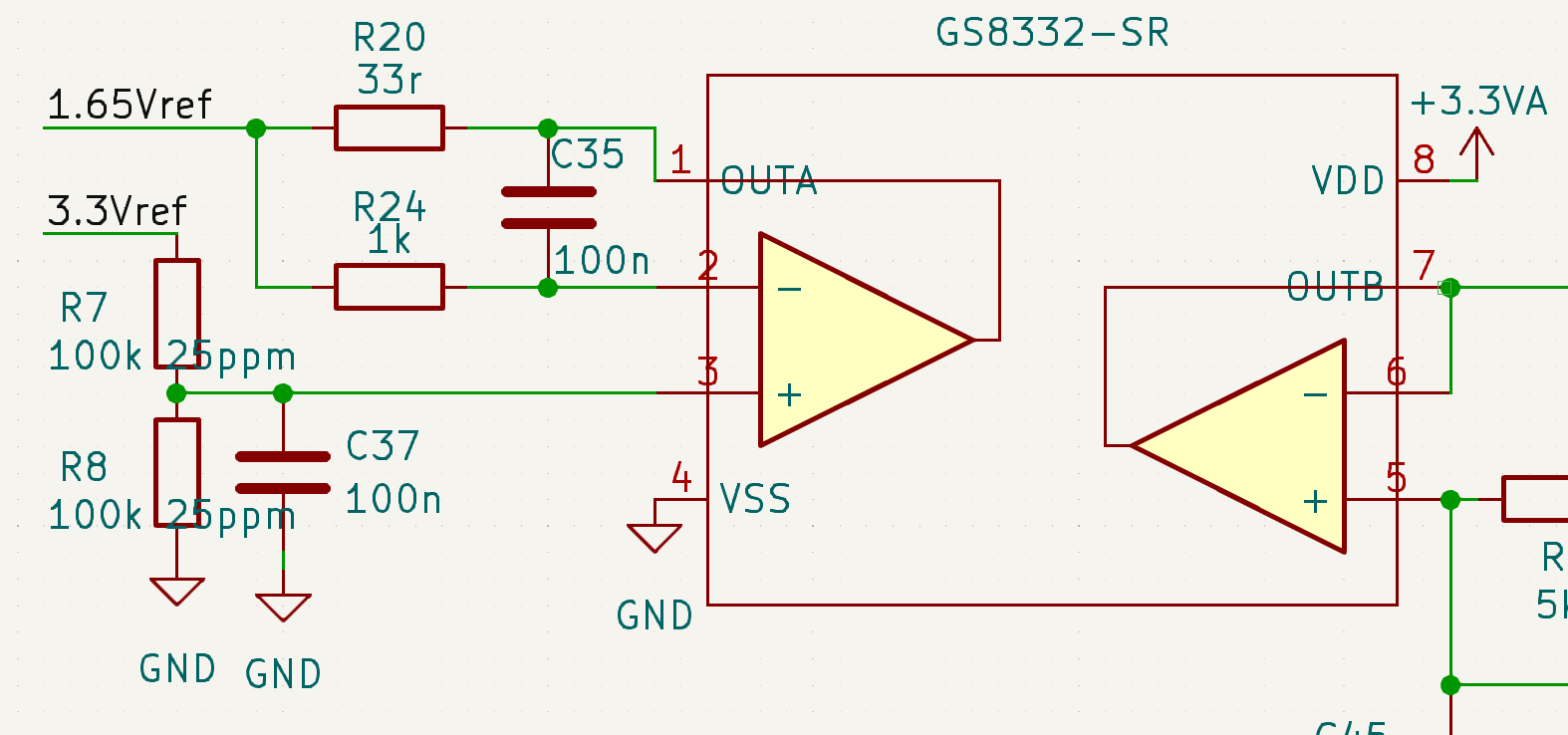 电流感应放大器所需的1.65V参考电压源由运放电路使用3.3V分压产生。使用阻容网络进行相位补偿,防止驱动容性负载时环路不稳定产生震荡。