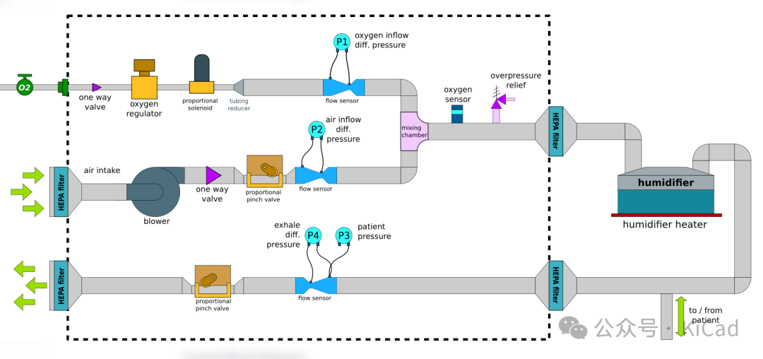 空气由鼓风机通过可更换的 HEPA 过滤器吸入,并在系统内加压使用。鼓风机保持相对恒定的速度,并进行开环控制。目前的版本还没有加入控制风扇速度以节省电能和延长响应时间的功能。离开风机后,加压(5 kPa)空气会通过一个止回阀,以防止氧气倒流进入鼓风机,因为鼓风机的额定值不包括氧气,可能会造成火灾风险。单向阀之后是一个比例夹紧阀,用于调节下游气流。它通过调节夹阀内置管道中气流路径的横截面积来实现这一目的。