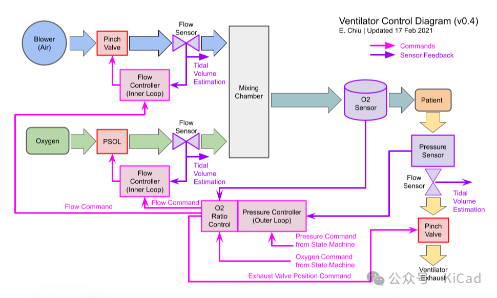从呼吸机 Rev 0.4 开始添加了一个单独的流量传感器,用于空气和氧气输入。整体结构为压力回路->流量指令->执行器。流动变得可控,而不仅仅是观察。