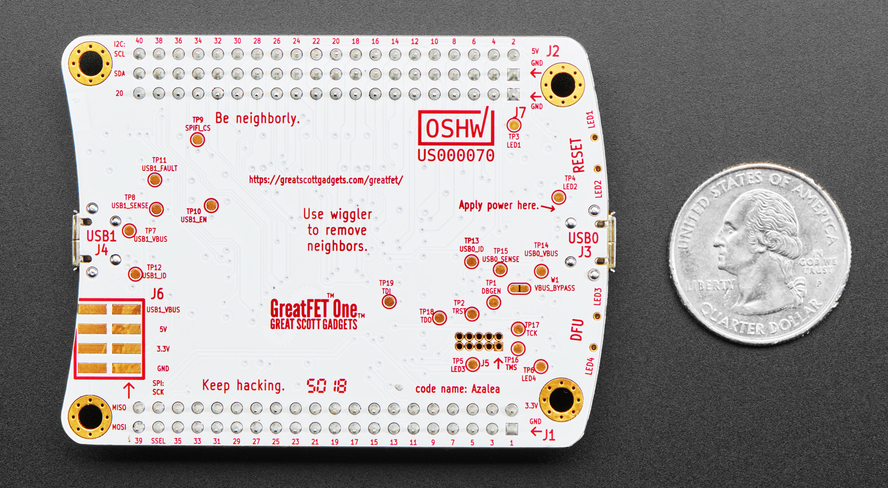 Great Scott Gadgets 公司的 GreatFET One 是硬件黑客最好的朋友。它的核心是一个功能强大的恩智浦LPC4330(Cortex M4 @ 204MHz),有两个USB端口,一个主机端口和一个外设端口,因此它可以充当USB接口的 “中间人”。GreatFET One采用可扩展的开源设计,有两个USB端口和100个扩展引脚,是黑客、创客和逆向工程的必备工具。通过添加称为 “邻居”的扩展板,你可以把GreatFET One变成一个USB外设,几乎可以做任何事情。