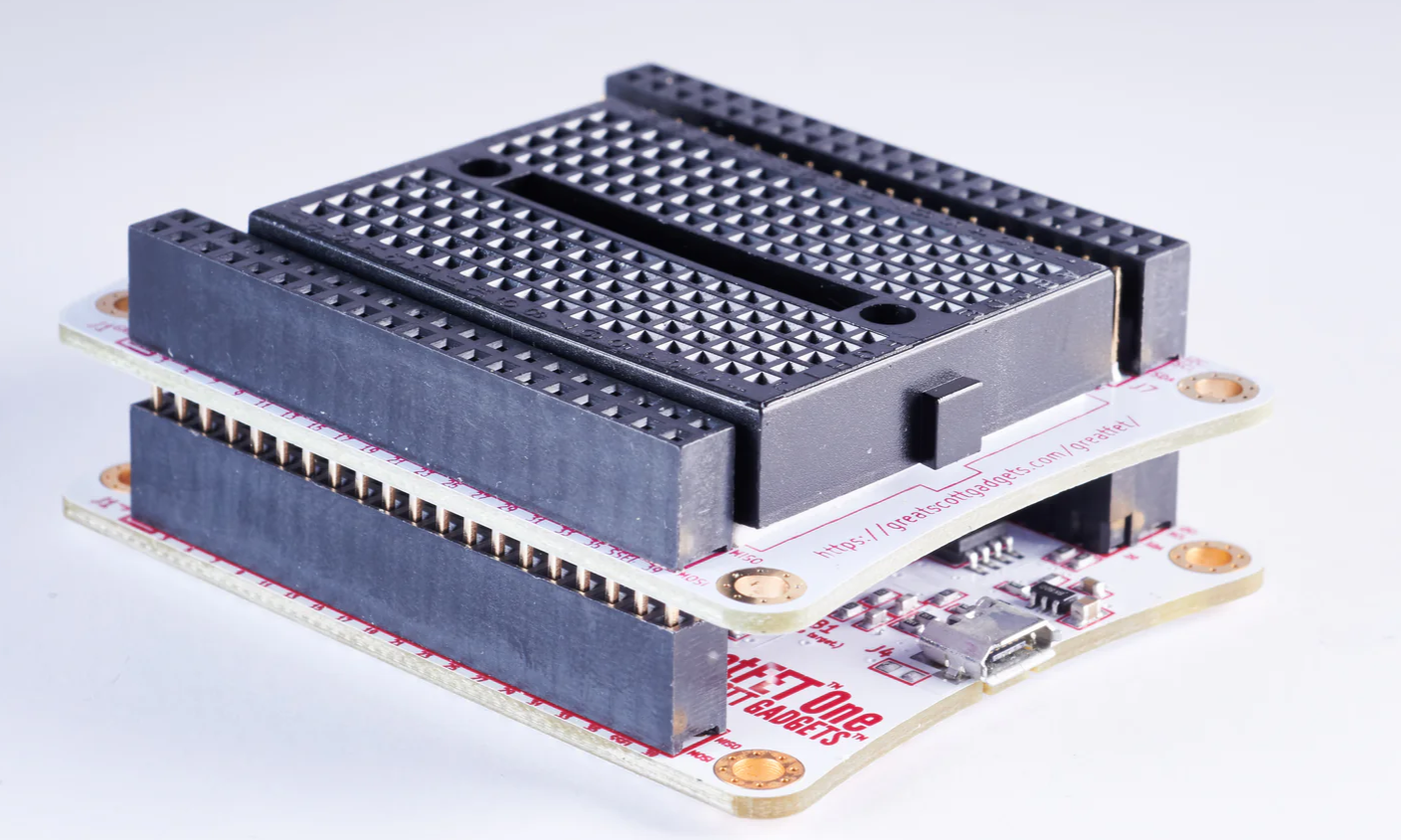 GreatFET 的 Daffodil Neighbor 提供了一个无焊面包板和一个用于通孔原型开发的小型可焊面包板区域。Daffodil 专为 SparkFun Electronics PRT-12047 无焊面包板而设计。面包板底部有一个胶垫,可以粘在 Daffodil 上。Daffodil 的底部没有电气连接。