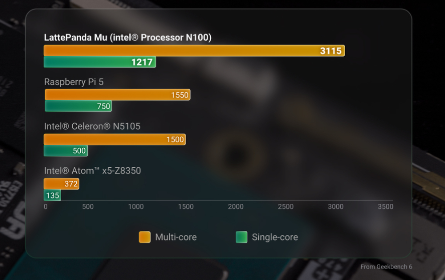 LattePanda Mu x86 计算模块采用英特尔 N100 四核处理器,主频高达 3.4GHz,可为大多数应用提供充足的性能和多任务处理能力。在 Geekbench 6 上的多核得分高达 3115 分,单核得分高达 1217 分,超过了 Raspberry Pi 5、英特尔赛扬 N5105 和 Atom x5-Z8350。其 CPU 性能是 Raspberry Pi 5 的两倍。