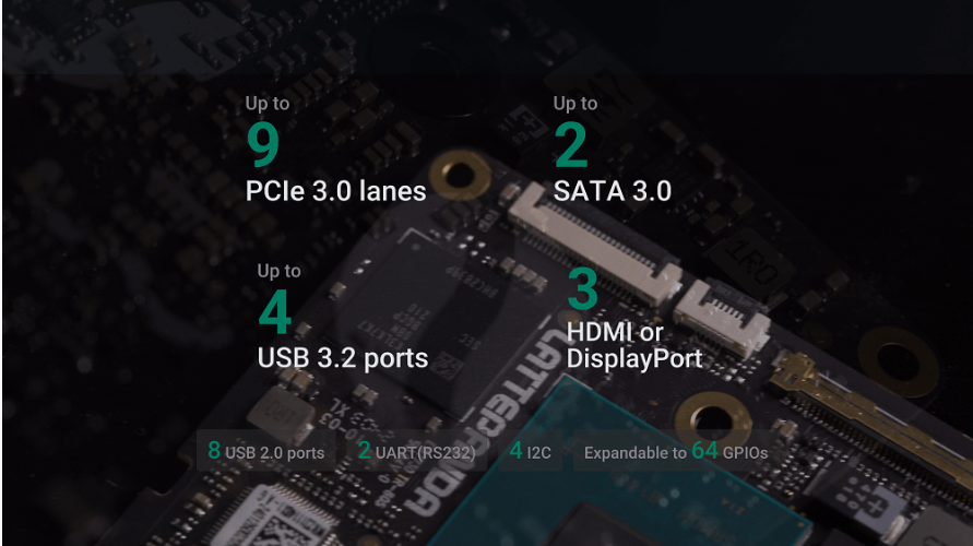 LattePanda Mu 扩展了大量引脚,如 3 个 HDMI/DisplayPort、8 个 USB 2.0、最多 4 个 USB 3.2、9 个 PCIe 3.0 通道、2 个 SATA 3.0 和 64 个可扩展 GPIO。这提供了无与伦比的灵活性和可扩展性,使您能够创建特定的解决方案。