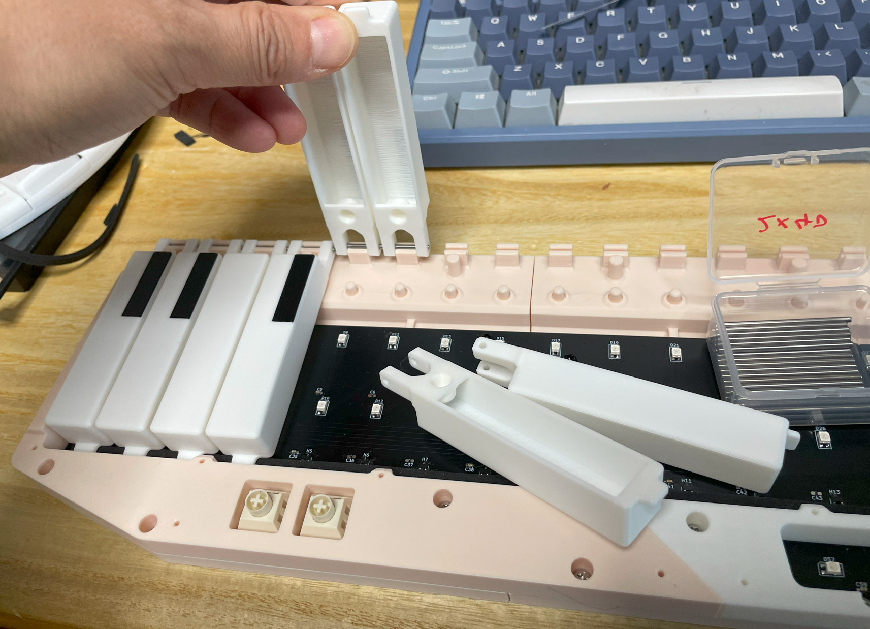将钢轴插入按键中,并将按键安装到底座部件上。请注意按键的排列方式。