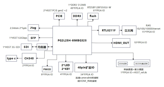 开发板核心采用紫光同创28nm工艺FPGA芯片PG2L25H-6IMBG325,配备1颗DDR3与Flash芯片,构成完整的最小系统,支持高速数据处理与存储。DDR3数据交互时钟最高达533MHz,位宽16bit,总带宽达17056Mbps,满足多路高速数据存储需求。板载4路HSST高速收发器,每路速率高达6.6Gb/s,适用于光纤通信与PCIe等高速通信场景。