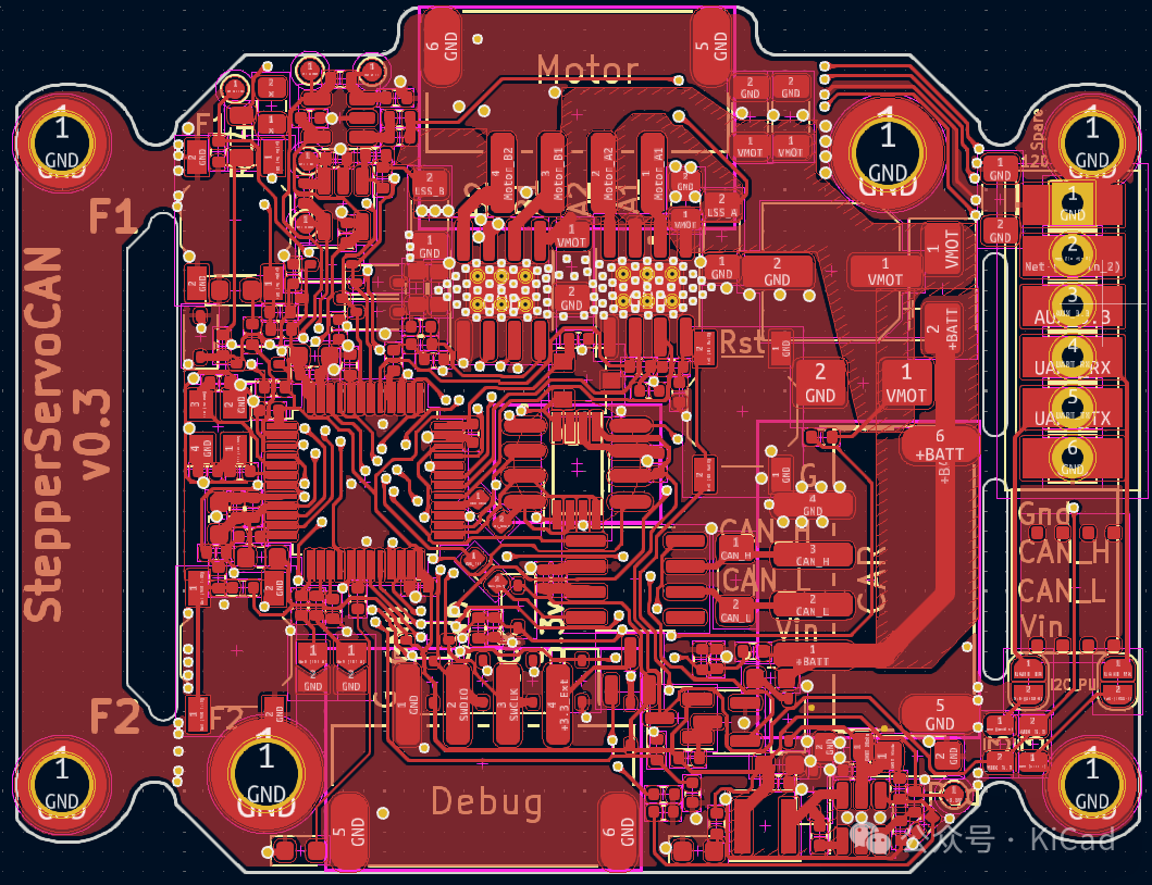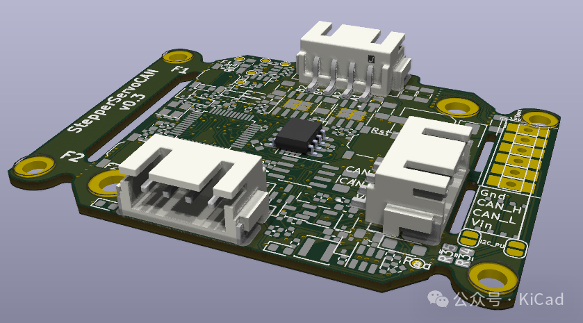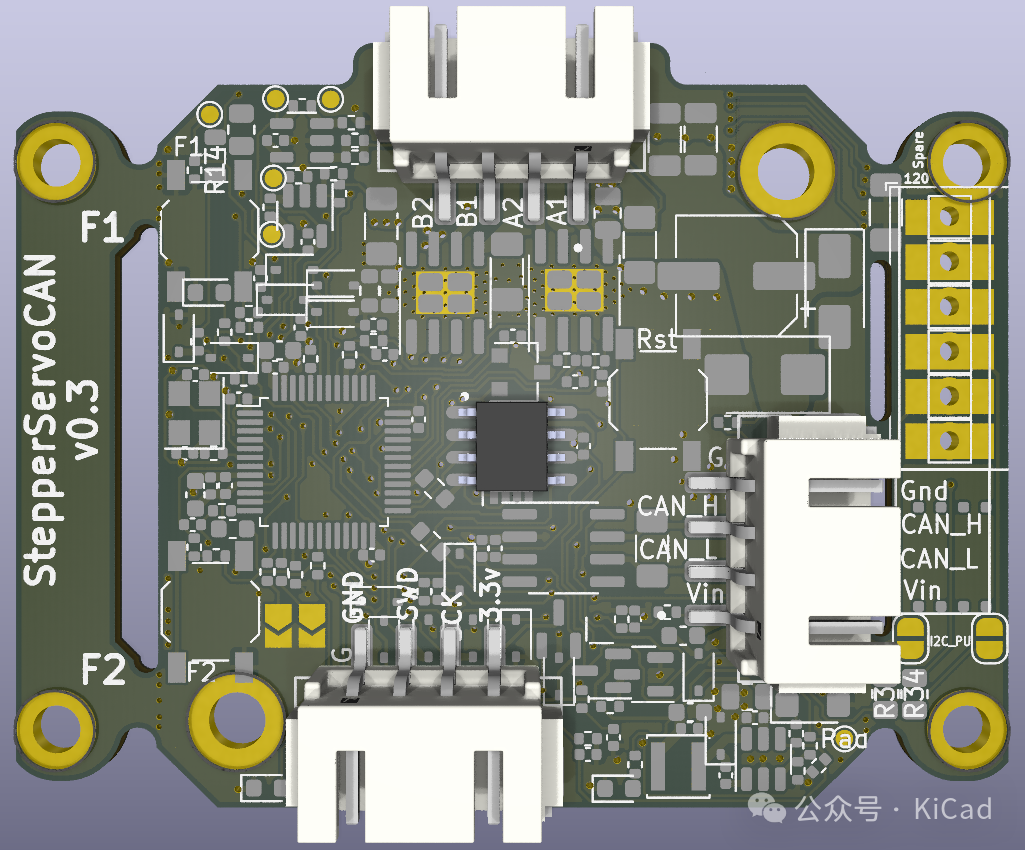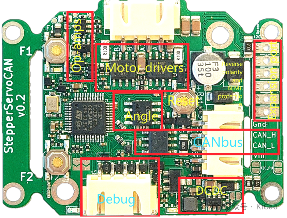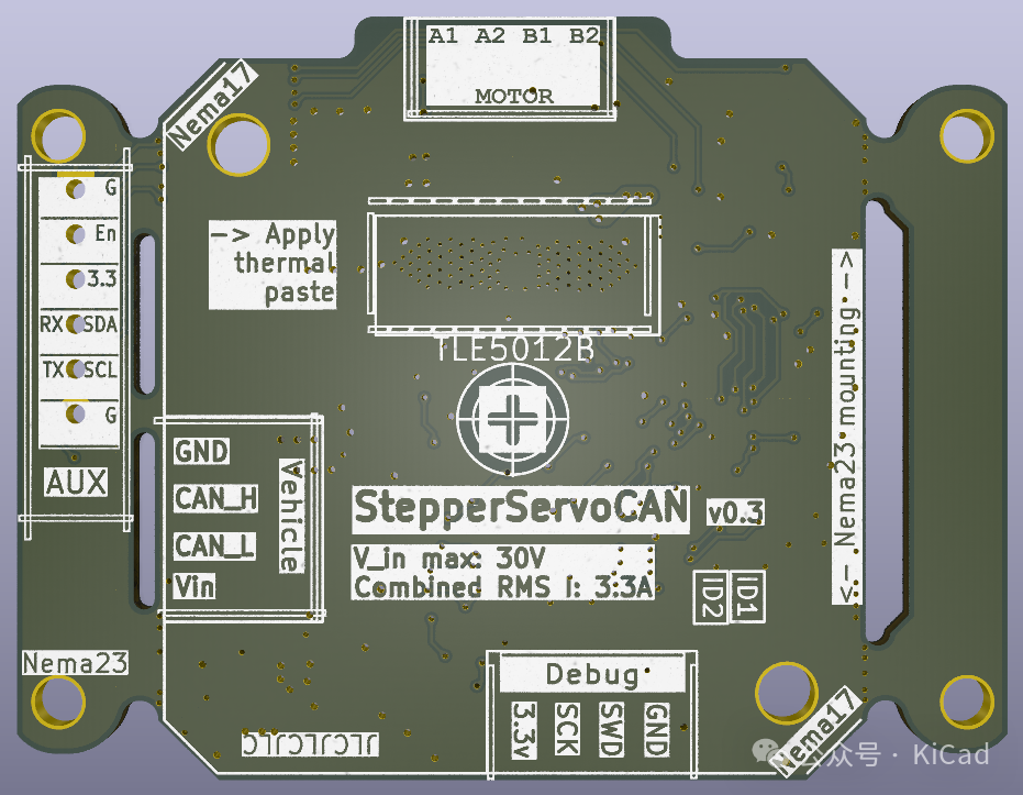 控制器板适合 Nema17 和 Nema23 螺栓模式,可直接安装在电机背面,高度仅为 8 毫米。此外,如果不需要 Nema23 支持,还可以断开 PCB 的侧片,减小 PCB 的尺寸。